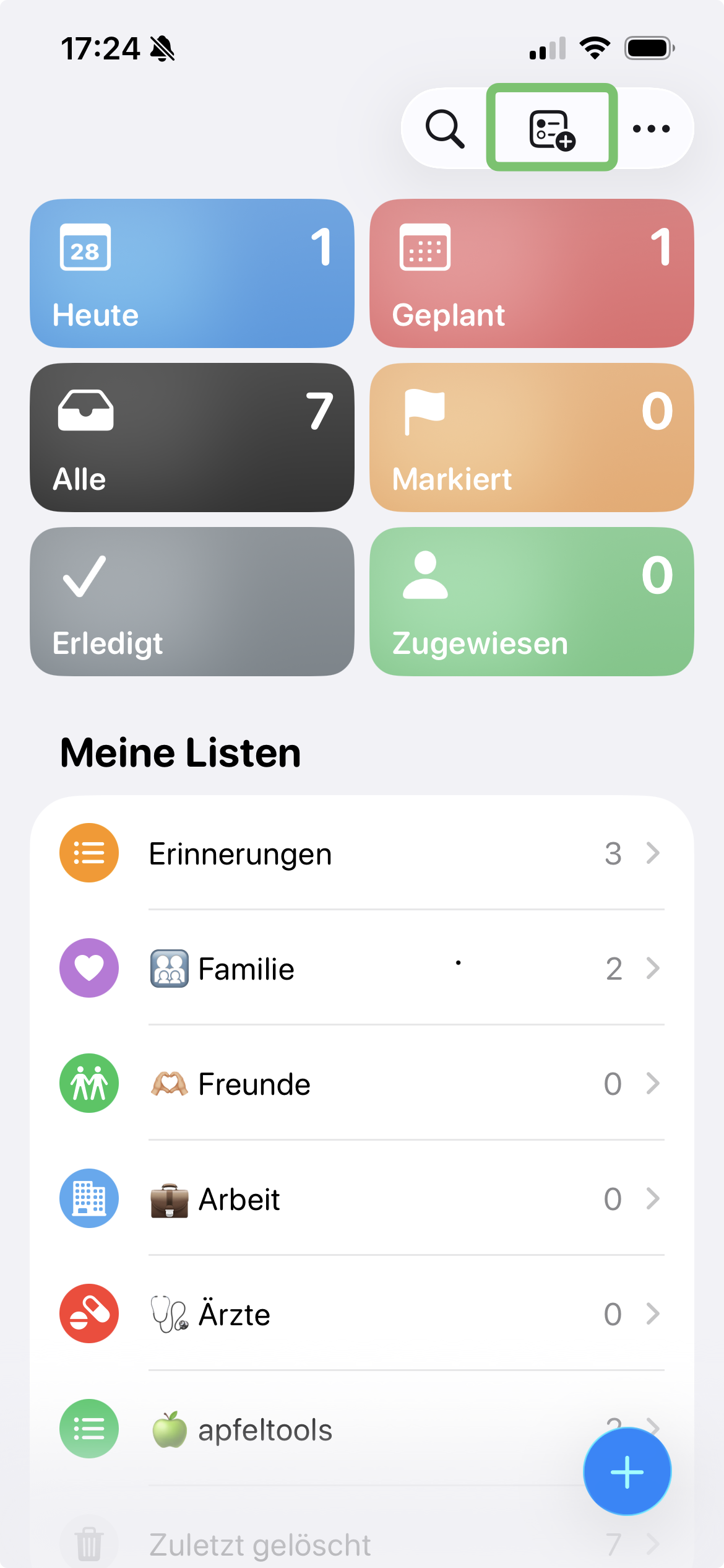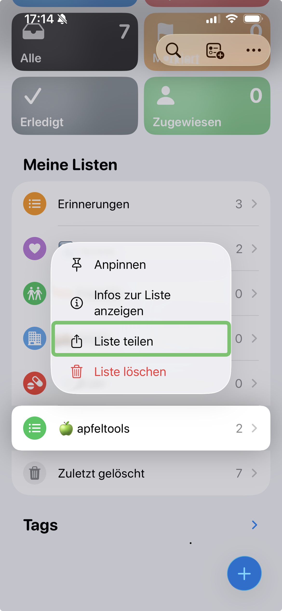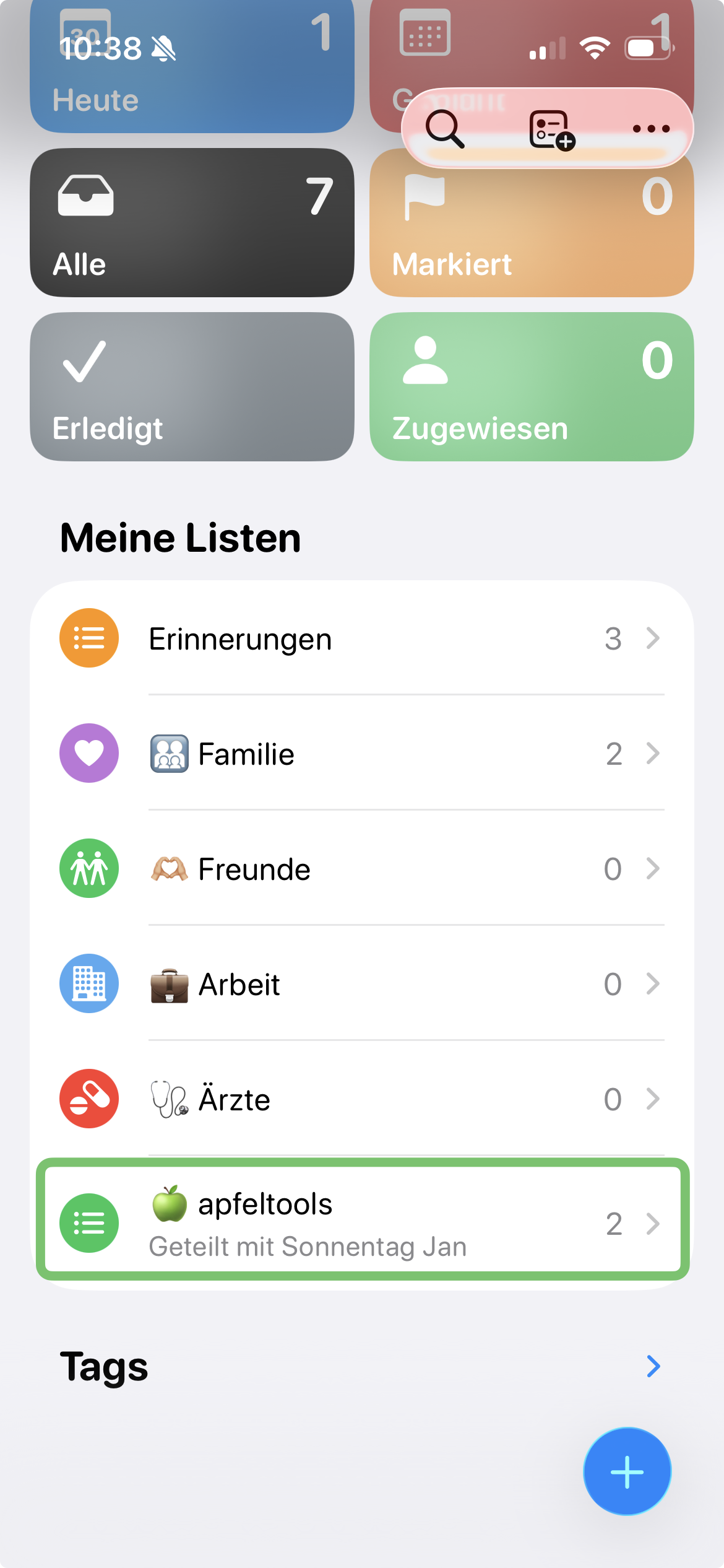 Wie du erkennst, taucht jetzt hier die Erinnerung auf. Ach ja im oberen Bereich erkennst, du, neben den drei Punkten rechts, dass dort kein Icon für die Freigabe gibt. Dieses liegt, wie bereits erwähnt an dem Listentyp „Intelligente Liste“
