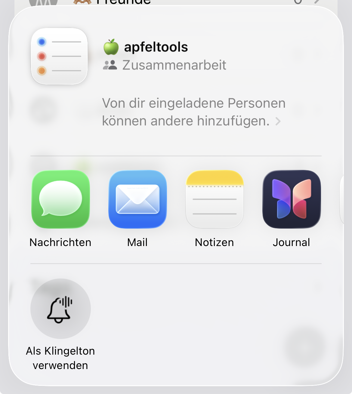 Darunter stehen dir dann Apps zur Verfügung mit denen du dann die Liste teilen oder aber auch in denen du die Liste als Verknüpfung hinzufügen kannst. Für das Teilen empfiehlt es sich in der Regel eher die App Nachrichten zu nutzen, somit schaffst du innerhalb der Apple-Welt eine saubere Geschichte. Per Mail geht natürlich auch, aber finde ich persönlich nicht so geeignet.