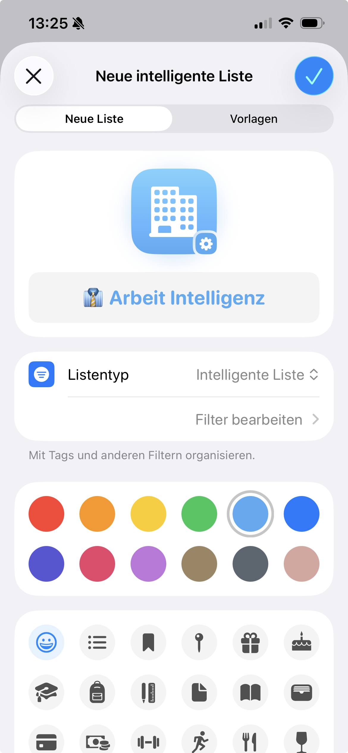 Bei den intelligenten Listen handelt es sich um einen „Ordner“ in dem alle Erinnerungen automatisch zugeordnet werden, die bestimmte Kriterien, wie Tags, Datum, Uhrzeit, Ort und vieles mehr beinhalten. Also wenn du einer Erinnerung / Aufgabe z.B. einen bestimmten Ort zugewiesen hast, an dem diese bei dir angezeigt soll (machen wir noch bei der Erstellung von Erinnerungen), kann diese einer „intelligenten Liste“ automatisch zugeordnet werden.