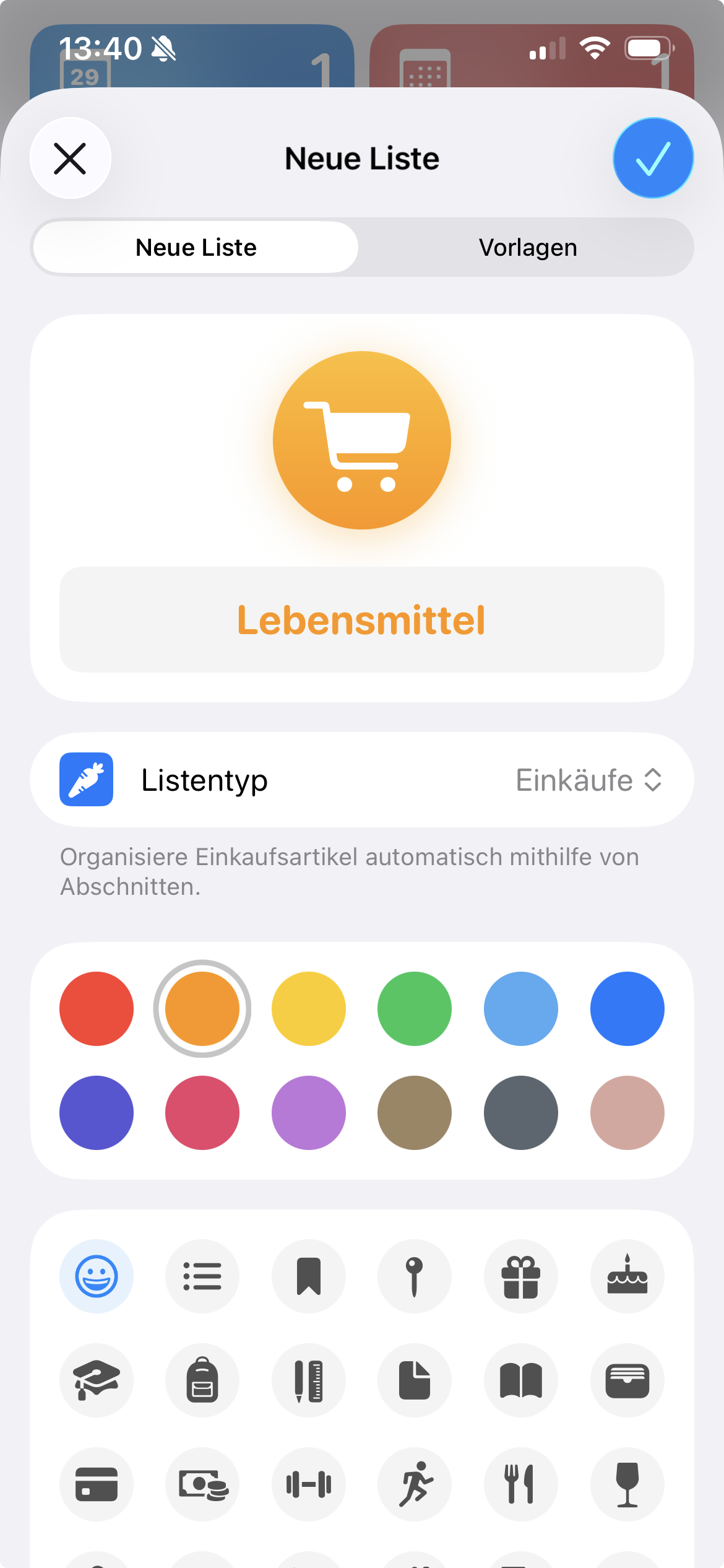 Erstelle auf der Übersichtsseite wieder über das Pluszeichen rechts oben eine neue Liste und wähle beim Listentyp “Einkäufe” aus. Schreibe einen einfachen Namen für die Liste rein z.B. den Namen des Lebensmittelgeschäfts, oder z.B. Einkäufe und bestätige das ganze mit dem “Blauen Haken” rechts oben.