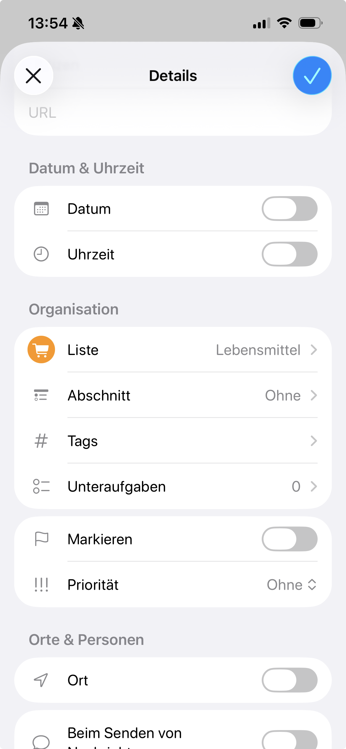 Unter der Rubrik “Organisation” findest du den Punkt „Abschnitt“, hier steht erst mal das Wort „Ohne“. einfach mal darauf tippen. Es öffnet sich eine neue Seite. Auf dieser Seite kannst du im unteren Bereich einen anderen Abschnitt auswählen oder im oberen Bereich einen neuen Abschnitt erstellen. Wenn du fertig bist einfach über den Pfeil links oben wieder zurück gehen und mit dem “blauen Haken” bestätigen.