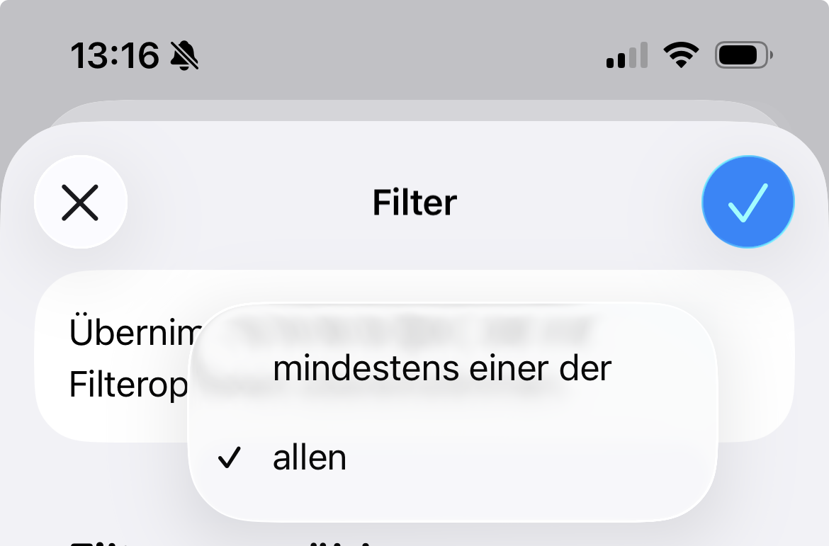 Im oberen Bereich des Filter-Popup´s kannst du entscheiden, ob für die Anzeige der jeweiligen Erinnerungen in der Liste alle im Nachgang ausgewählten Kriterien erfüllt sein müssen oder nur mindestens ein Kriterium.