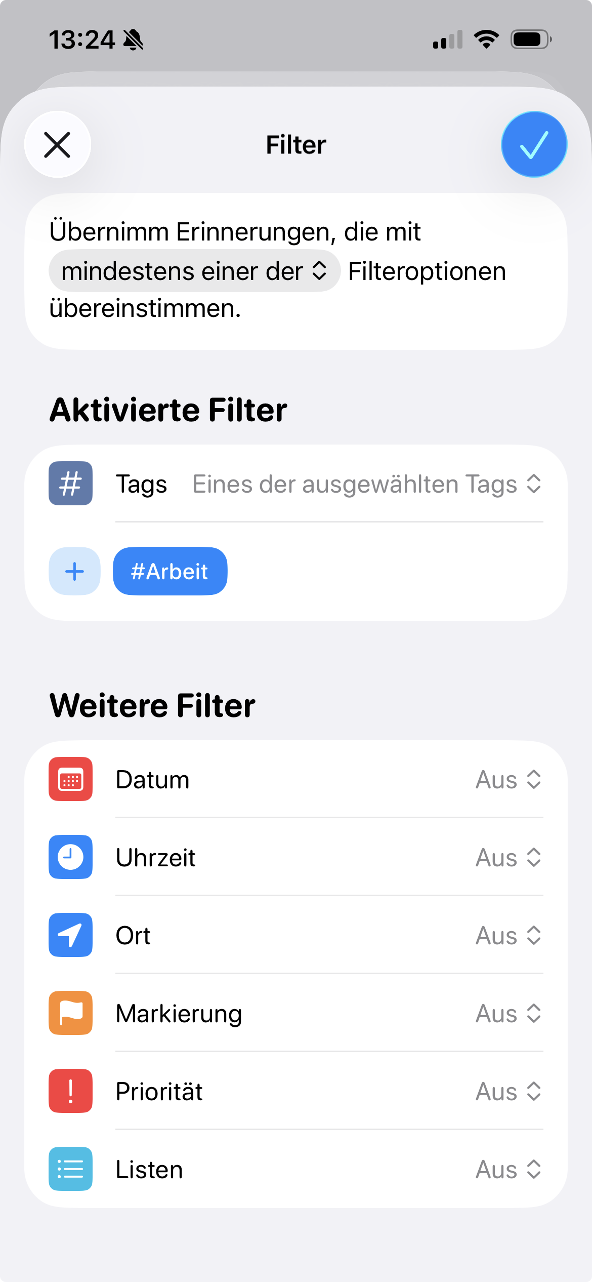 Für unser Beispiel mit den Erinnerungen und dem Stichwort „Arbeit“ tippen wir jetzt auf den Punkt “Tags” und dann direkt auf „Eines der ausgewählten Tags“.